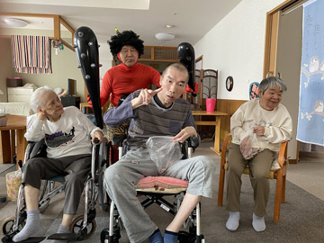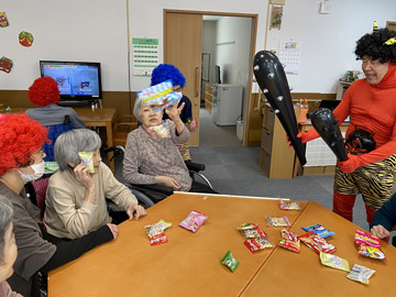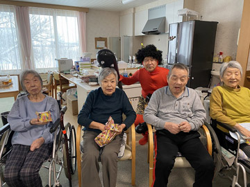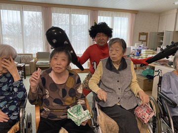 2月3日に「節分の豆まき」を行いました。鬼に扮した職員が各ユニットを回り、入居者の皆さんの前に現れました。皆さん勢いよくお菓子を投げていました。鬼との記念撮影もあり、楽しんでいただけたようです。
