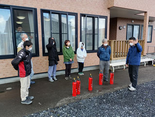 稚内消防署立ち会いのもと、スモークマシーンを使用し、1階作業場の冷凍庫から火災を想定した避難訓練を行いました。煙は階段を伝うように、煙が上がっていき視界が遮られていましたが、利用者の皆さんは、煙が入らないように口をハンカチや腕で覆い、手すりに捕まり落ち着いて階段を降り、避難していました。その後消火器の訓練を行いました。油火災の時、消火器を使用する場合は、火元の近くで消火器を噴射すると、勢いで油が飛び跳ね、自分自身が火傷をする危険があります。消火器で初期消火する場合は、火元から離れた場所から噴射しながら火元へ近づくと安全に初期消火出来ると、消防署職員の方から教えて頂きました。暑い中ご指導頂き、稚内消防署職員の皆さまありがとうございました。
