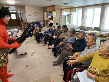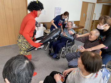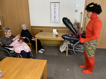 2月3日に「節分の豆まき」を行いました。鬼に扮した職員が各ユニットを回り、入居者の皆さんの前に現れました。皆さん勢いよくお菓子を投げていました。鬼との記念撮影もあり、楽しんでいただけたようです。