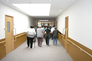 片道約100mのジュウタン敷きの廊下ですので、天候、季節に左右されず安全に歩くことができます。一日で2、3往復されるご利用者の方もおられます。